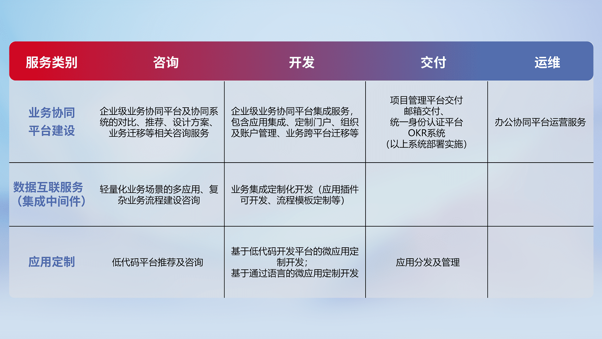 针对钉钉、、企微、、、、IDaas等平台级产品提供产品的规划、、、方案、、、、交付、、、定制化开发等服务,,,实现如统一协同办公、、智能客户服务、、、混合会议管理、、、、智能数据查询、、、、等业务场景,,,实现数字化转型。。。