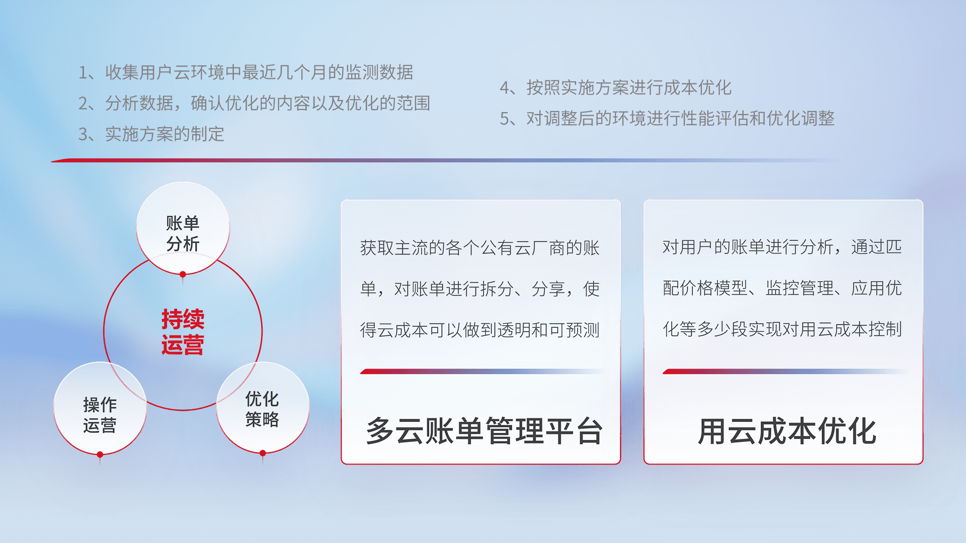 通过多云纳管,,以统一的资源数据模型把客户的云资源进行抽象和封装,,,进而实现对多云资源的统一操作,,保障云资源管理的可靠性、、、、稳定性与可用性。。。量身定制化运维内容,,配置、、、开发运维、、、、补丁管理、、、备份、、、监控、、认证和访问管理、、、审计和日常巡检等,,保障在用云过程中的可靠度,,,稳定度以及高可用率。。