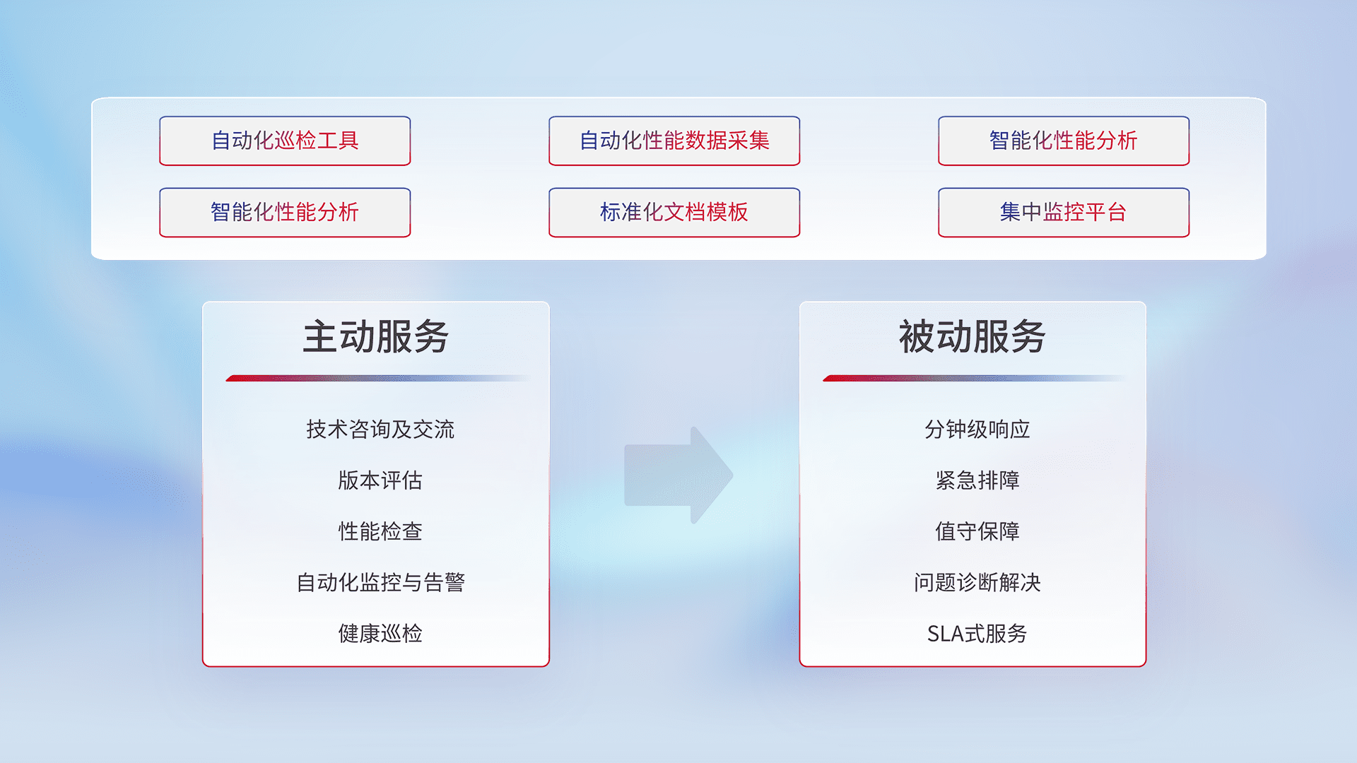 智能化工具和标准化文档,,保障服务质量,,,提供主动服务(包含技术咨询、、、版本评估、、性能检查、、自动化监控与告警、、、、健康巡检)和被动服务包含(分钟级响应、、、紧急排障、、值守保障、、、、问题诊断解决、、、SLA服务)。。