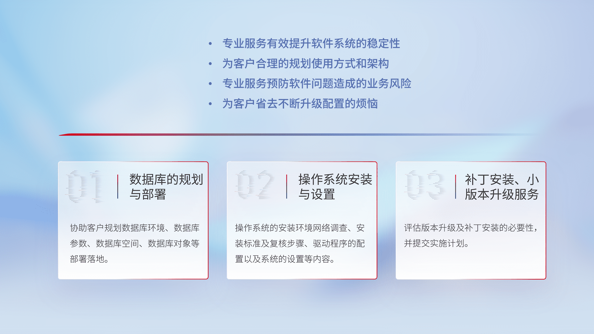 为客户提供软件规模升级、、、快速部署、、、、按需配置的专业服务,,,,从数据库的规划与部署到操作系统的安装与设置,,,再到补丁安装和小版本升级提供支持。。。
