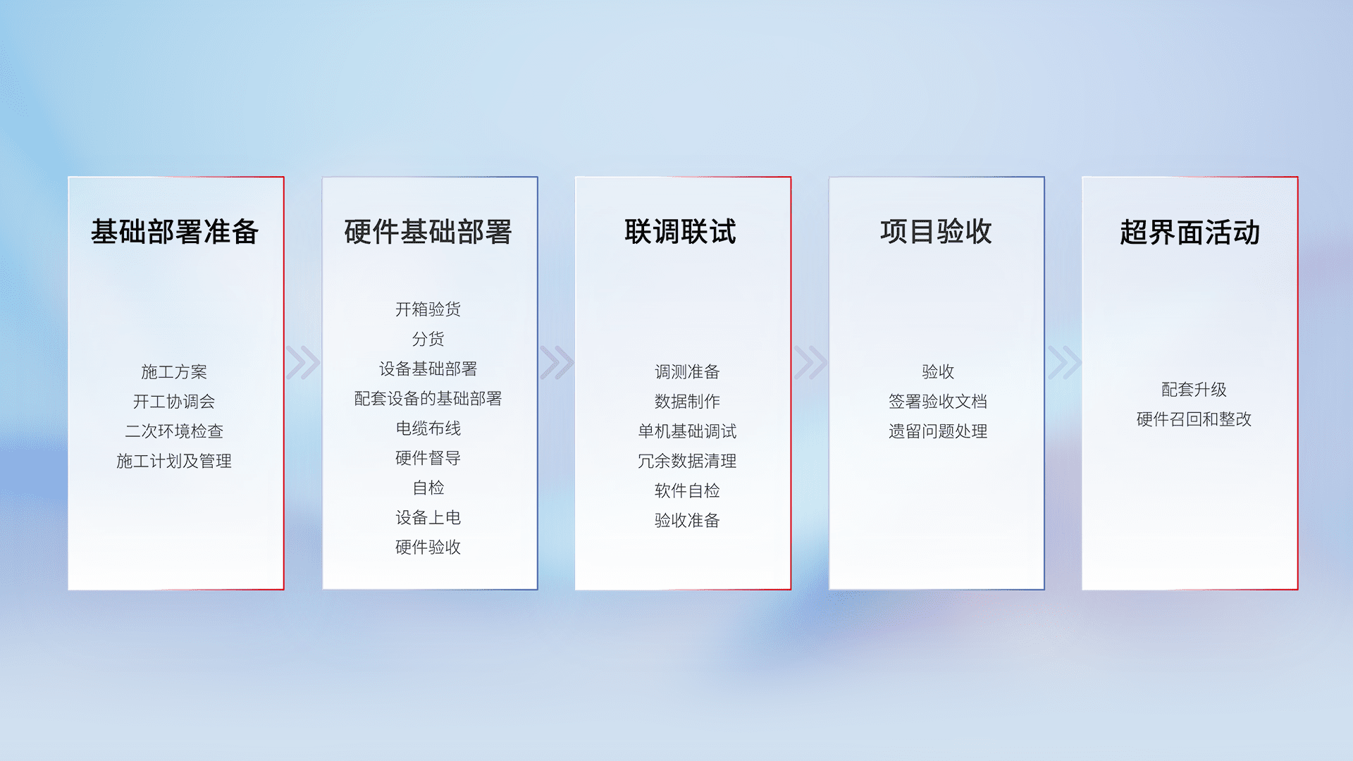 从基础部署准备、、、硬件基础部署、、联调联试、、、、项目验收、、、、越界面活动的全过程可追溯,,保证施工质量和进度。。。。